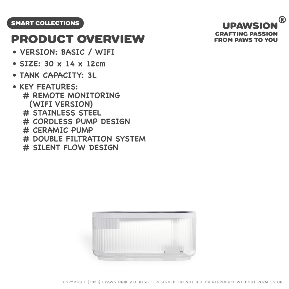 - App Monitor & Control: Our dedicated mobile app empowers you to monitor the water level, receive notifications when it's time to change the filter or clean the fountain, and control the fountain's on/off status for superior convenience.