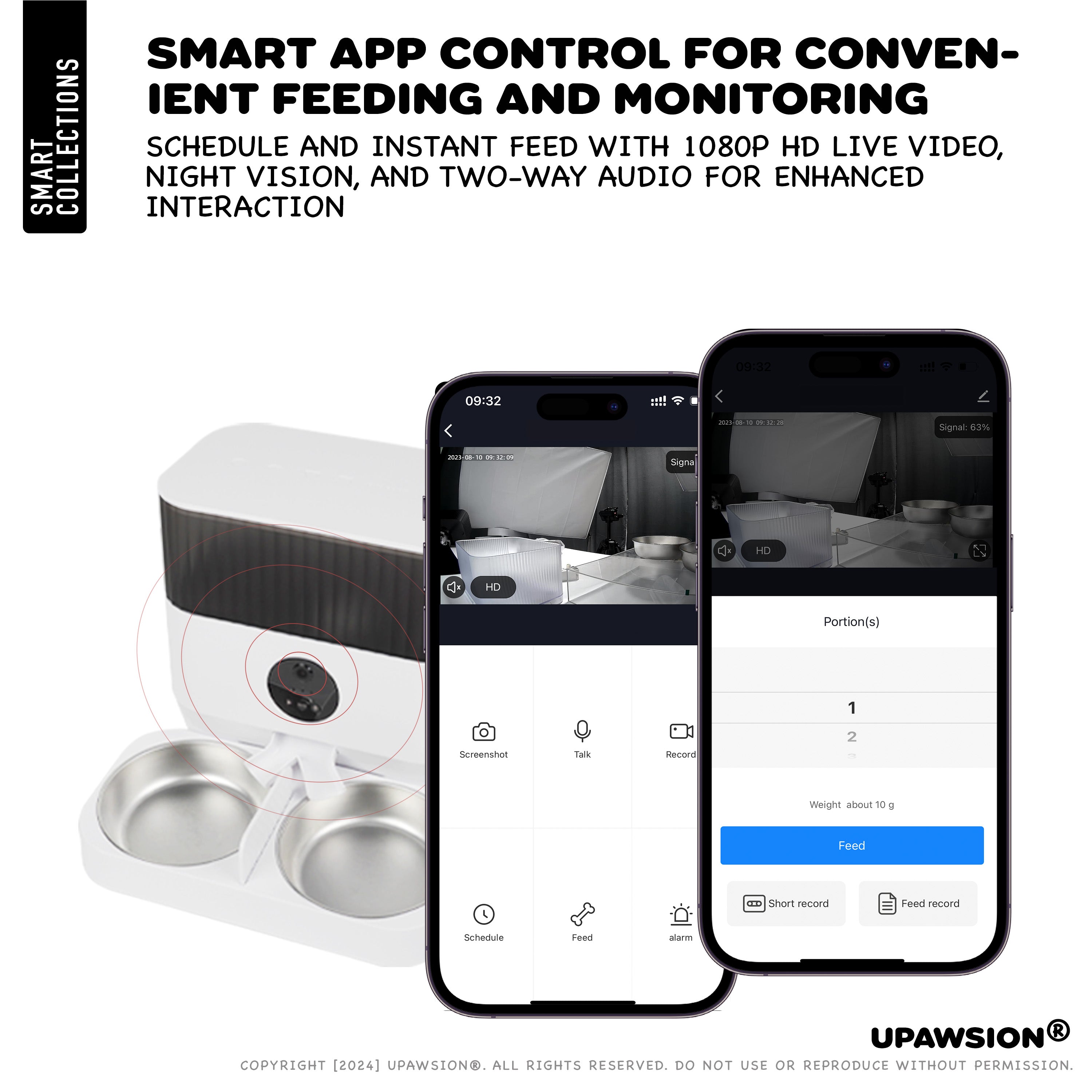 - Live Video Monitoring (Camera Version): Connect with your pet from anywhere using mobile app that streams high-resolution, live video from the feeder's built-in camera. Monitor pet’s eating habits and overall well-being, regardless of your location.